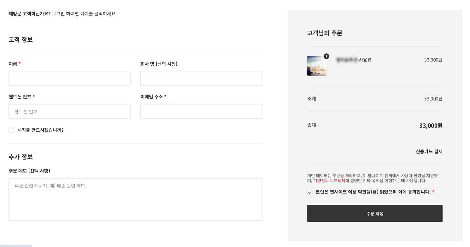 체크아웃 한 페이지에서 모든 상품 주문 결제가 진행됩니다. 컨퍼런스, 세미나 티켓 등 소량의 지정된 상품만 판매할 때 유용합니다.