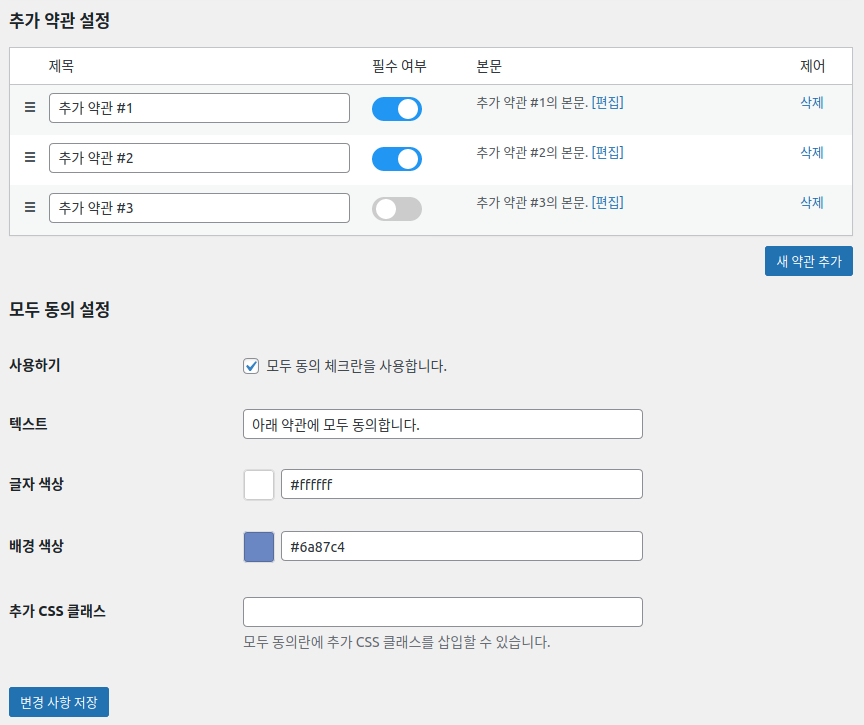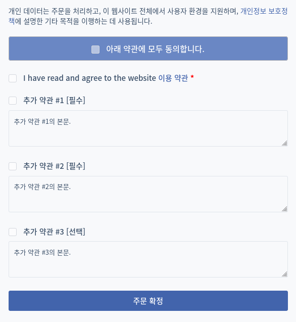 결제 화면에 필수/선택 약관 필드를 추가로 삽입할 수 있습니다.