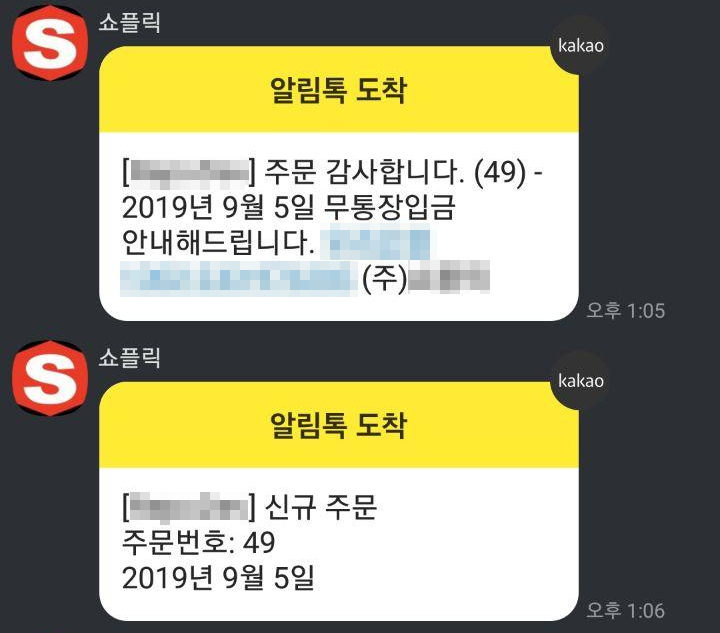 주문 생성, 결제, 완료, 입금 안내 메시지를 카카오톡으로 받아 볼 수 있습니다.