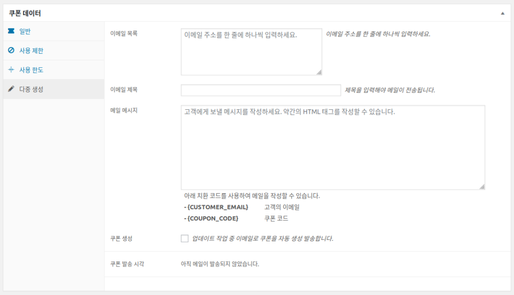쿠폰을 다중 생성하여 이메일로 송부해 보내는 우커머스용 쿠폰 확장 플러그인 입니다. 기존 우커머스 쿠폰 기능에 추가적인 다양한 기능을 업그레이드 한 플러그인입니다.